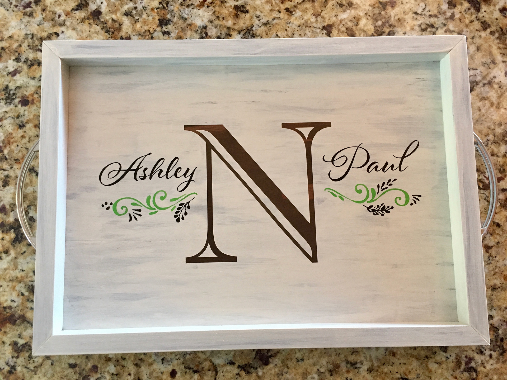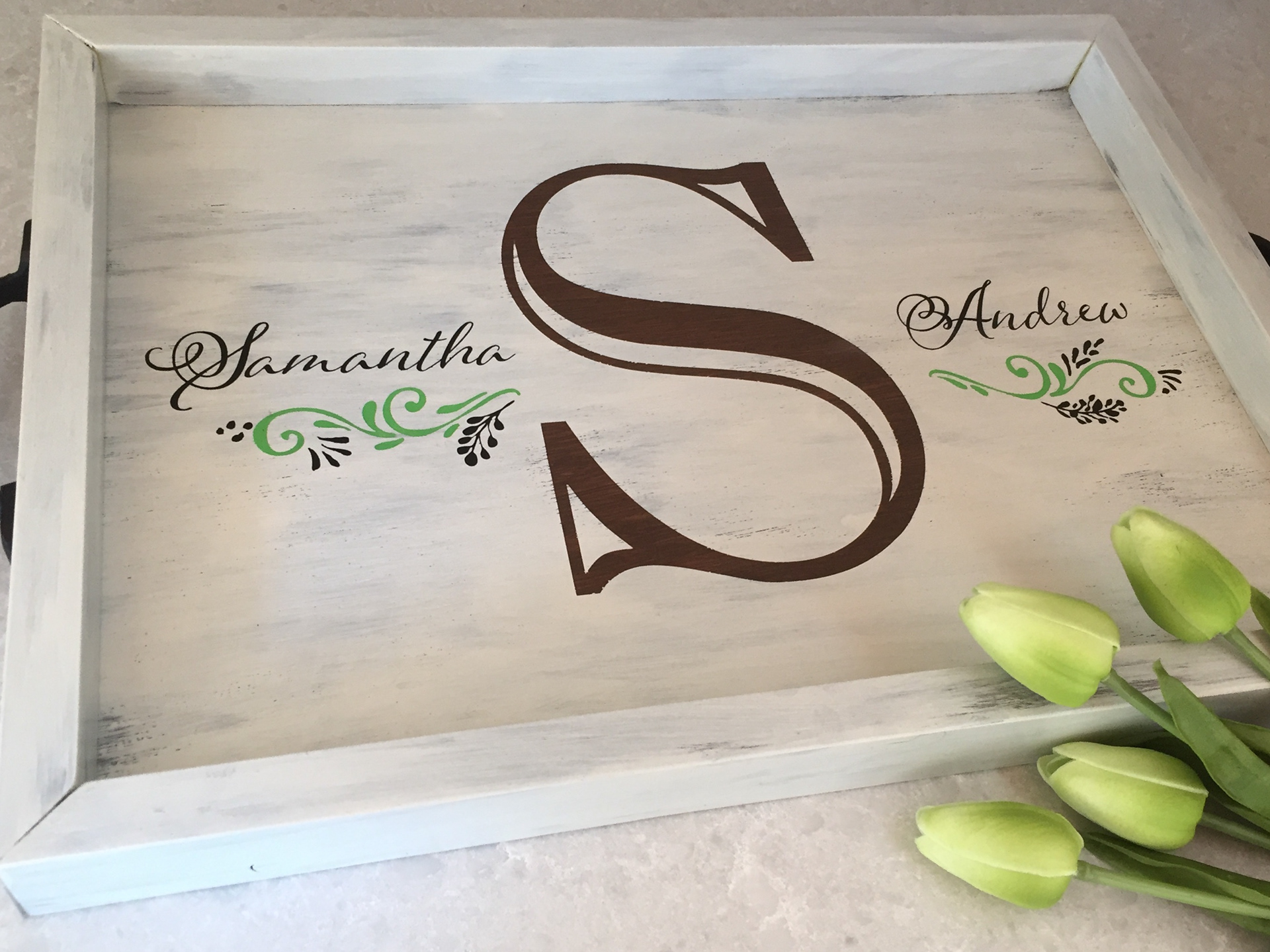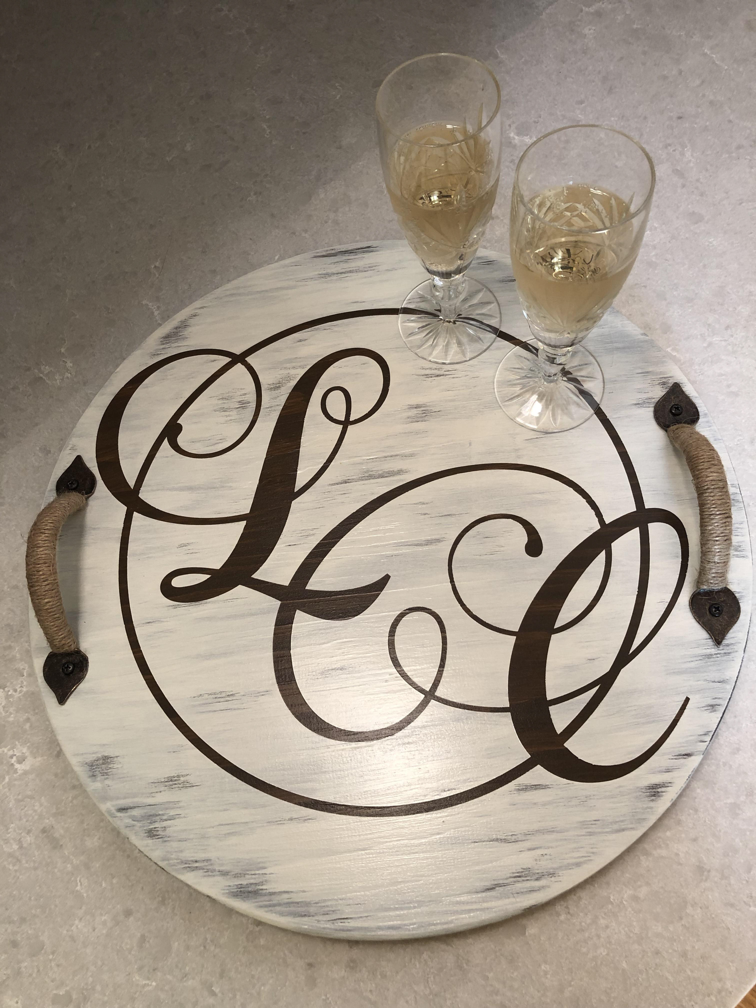 Personalize a tray with either a couple's name and initials or a custom designed monogram. Make a great new home, engagement or wedding gift! Rectangular trays measure 17.5" x 12.5". PRICE: Starting at $60